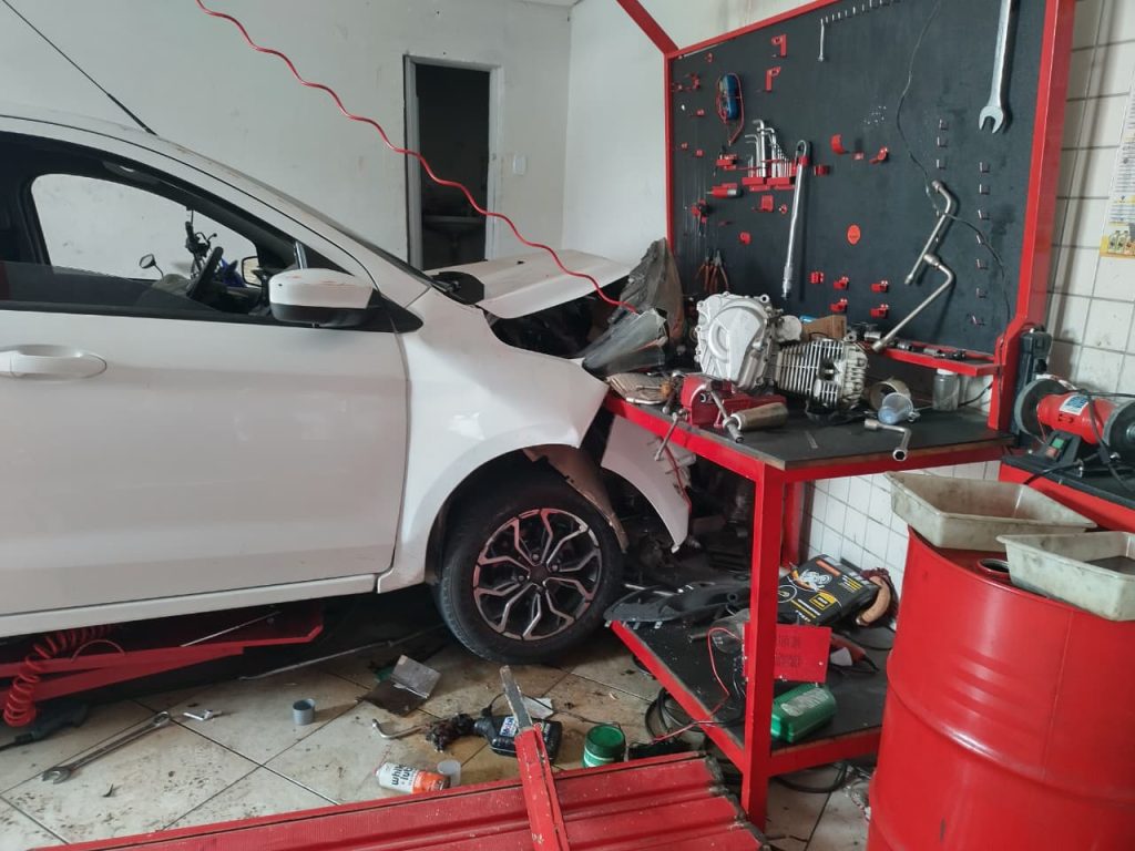 Policiais militares do 14º BPM foram acionados nas primeiras horas da manhã desta sexta-feira (21) para atender uma ocorrência de acidente de trânsito em Serra Talhada. Ao chegarem ao local, constataram que o condutor de um Ford Ka havia perdido o controle do carro e colidido violentamente contra a fachada de uma oficina mecânica, causando danos à porta de entrada e a diversos equipamentos internos.