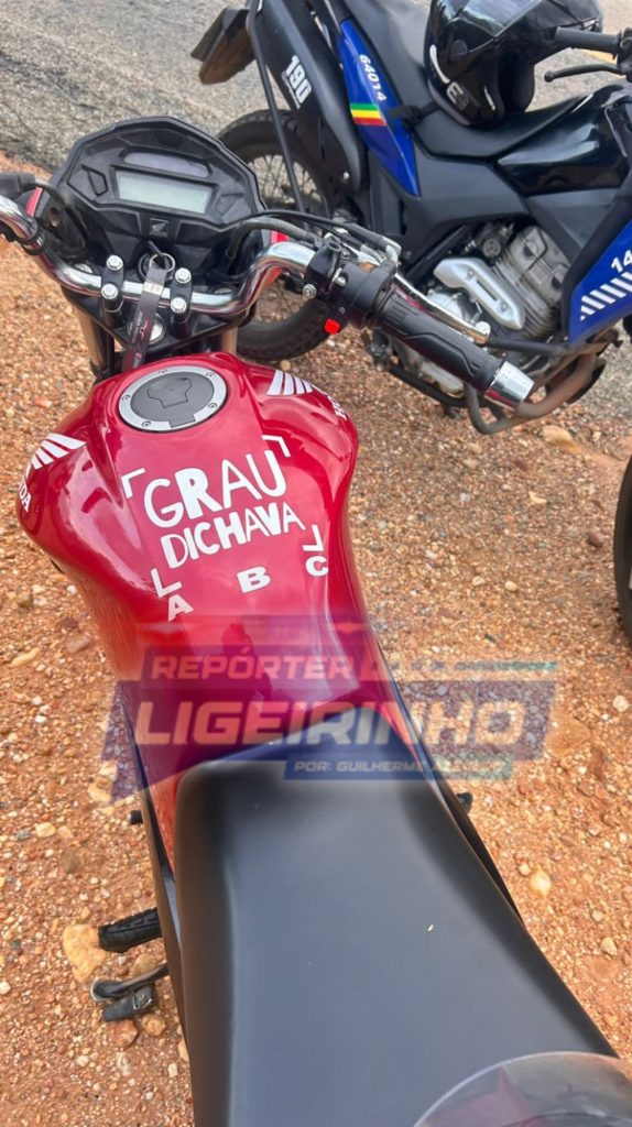Ao chegar ao local, o efetivo visualizou um dos envolvidos realizando a manobra conhecida como “grau”. Ao perceber a aproximação da viatura, o suspeito fugiu em alta velocidade. Após acompanhamento, ele foi interceptado alguns quilômetros adiante.